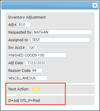 14. The final step is to post the adjustment. Enter P in the Next Action field and press Enter.