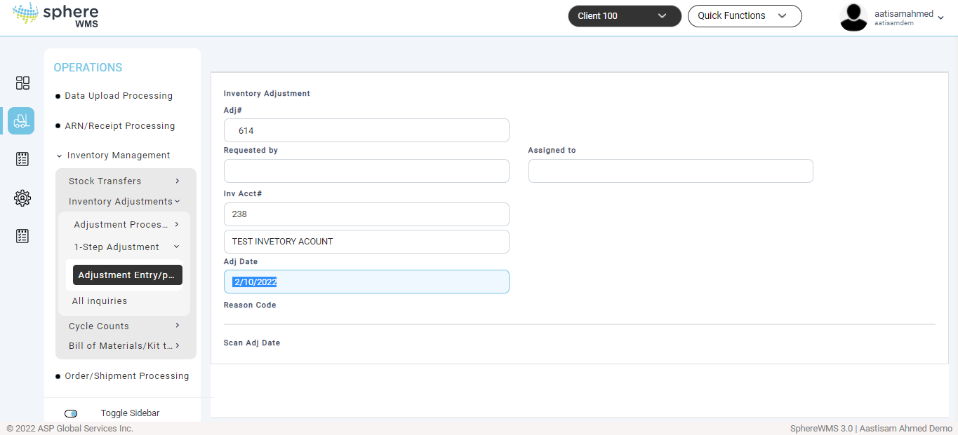 1. Navigate to Operations > Inventory Management > Inventory Adjustments > 1 Step Adjustment > Adjustment Entry/Post.