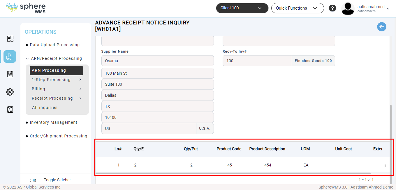 The Advance Receipt Notice Inquiry page will display. In the below screenshot 1 is the header for the selected ARN and 2 is the lines for the selected ARN.