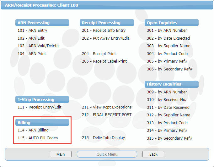 The Billing section allows you to perform billing transactions including ARN billing, creating new bill codes, and edit existing bill codes.
