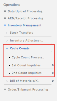 To access the Cycle Count Processing Menu, select "Inventory Management" from the Navigation Menu and select "Cycle Count" from the dropdown list.