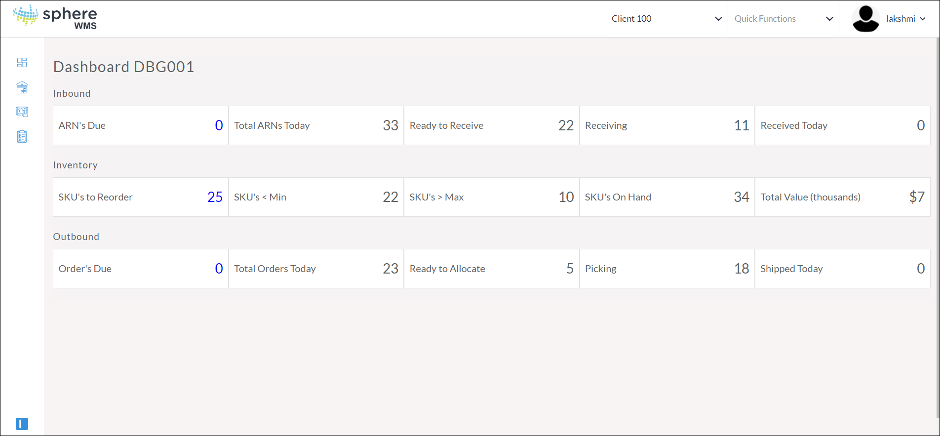 Inbound - displays the number of ARNs Due, Total ARNs Today, Ready to Receive, Receiving, and Received Today.