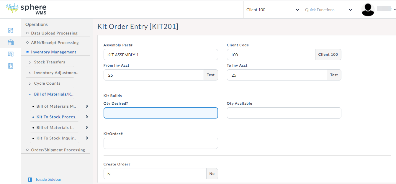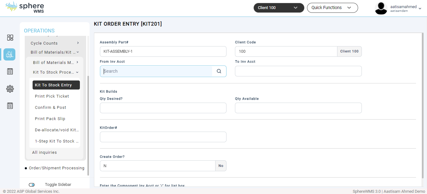 1. Navigate to Operations > Inventory Management > Bill of Materials/ Kit to Stock > Kit To Stock Processing > Kit To Stock Entry.