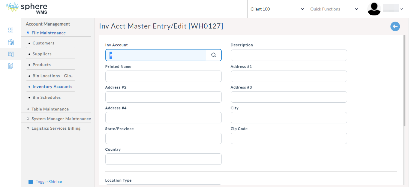 Inventories Account IDs are unique by the Client. Unlike other Master files, their Inventory Account IDs may not be shared across multiple Clients. For example, if a Client's Inventory Account "100-Primary" has been set up in the system, another Client must select a different number other than "100" for their Primary inventory account location.