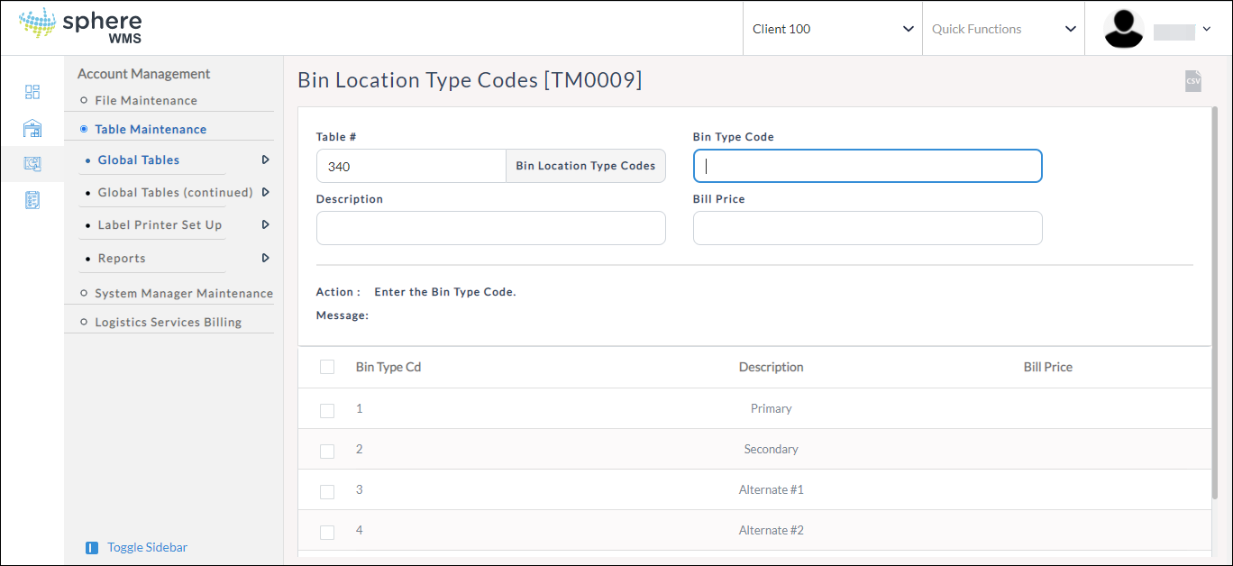 1. Navigate to Account Management > Table Maintenance > Global Tables > Bin Location Type Codes.