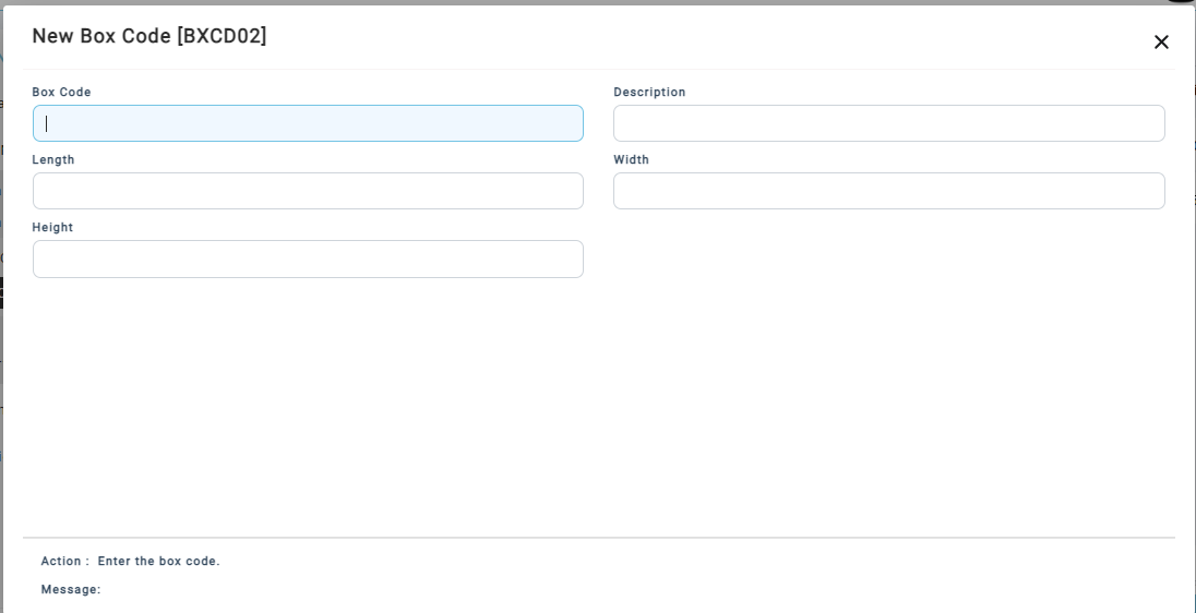 3. Enter the Box Code, Description, Length, Width, and Height.