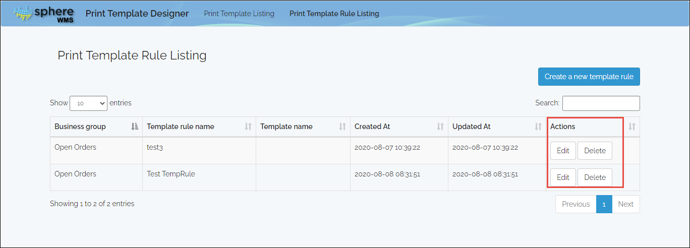 The Print Template Rule Listing page will display.