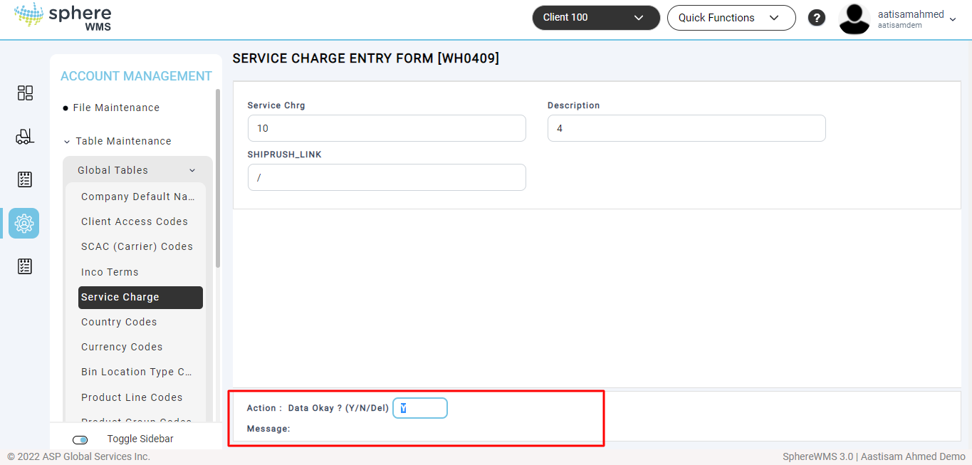 2. To add a new service charge, enter the Service Chrg, Description, and SHIPRUSH_LINK in the respective fields.